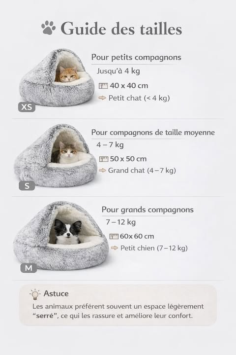 Les animaux recherchent des espaces fermés et chauds par instinct — notre capuche enveloppante les rassure immédiatement.