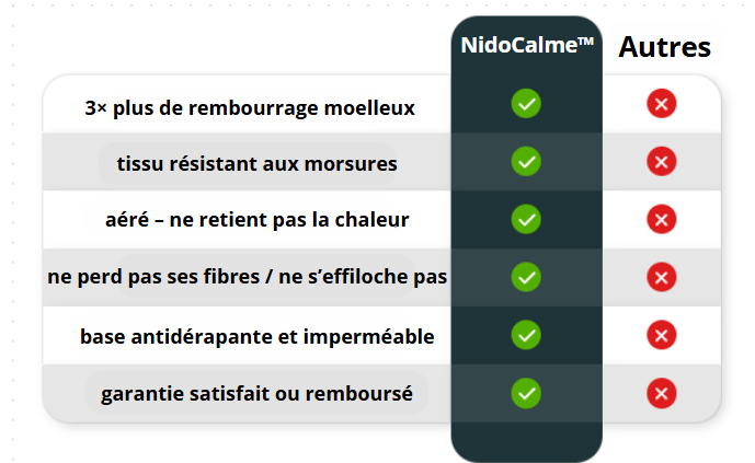 Les copies s’affaissent en quelques semaines — le NidoCalme™ est conçu pour durer.
